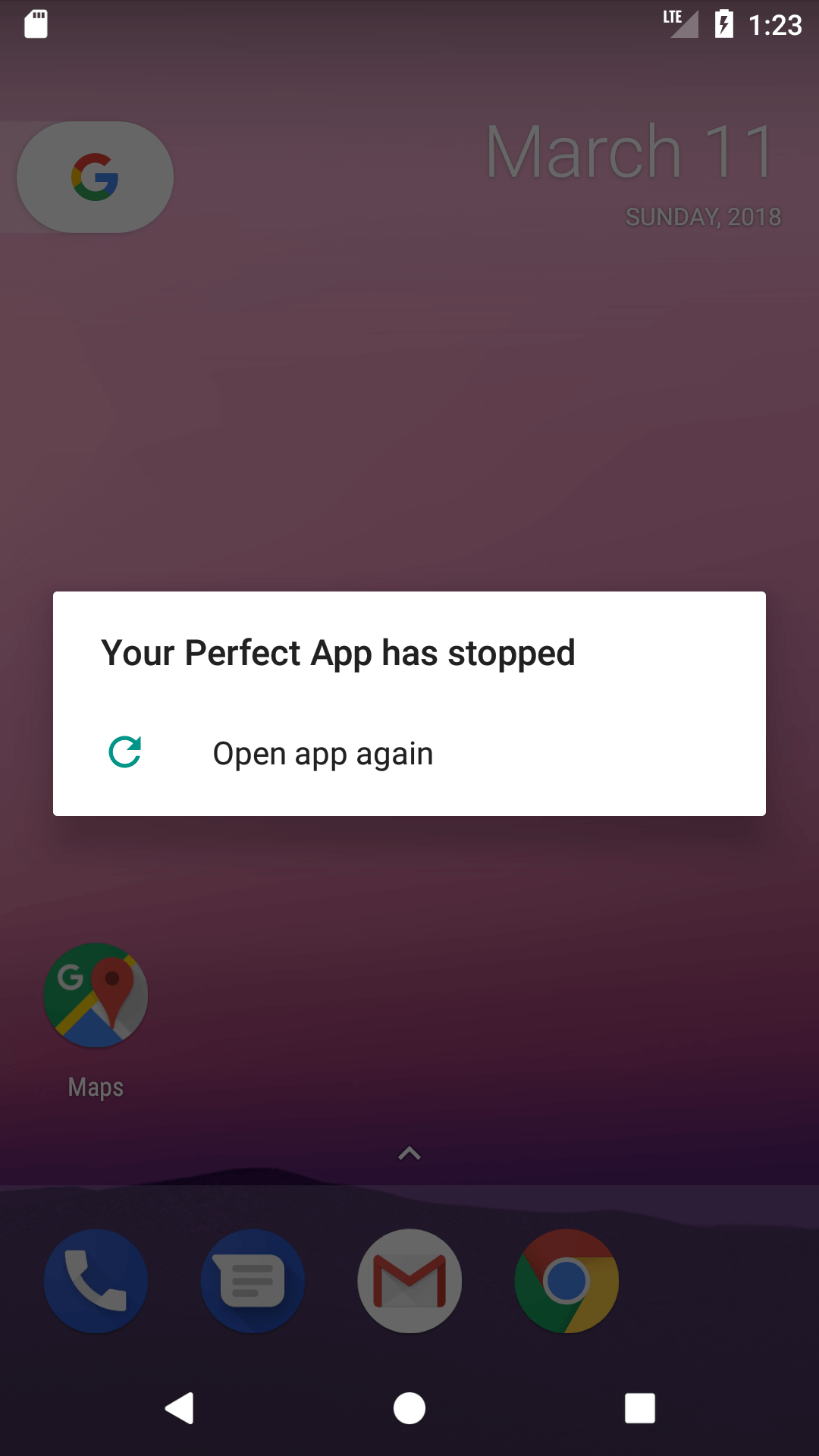 - You can’t tell your user what to do next. Again, Oreo apparently does let you restart your app, but some other versions don’t. You don’t control the message.