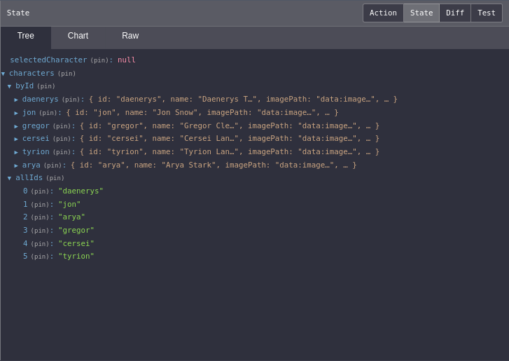 charactersis static data about the different Game of Thrones characters (using byId and allIds pattern)selectedCharacteris the ID of the currently selected character in the dropdown